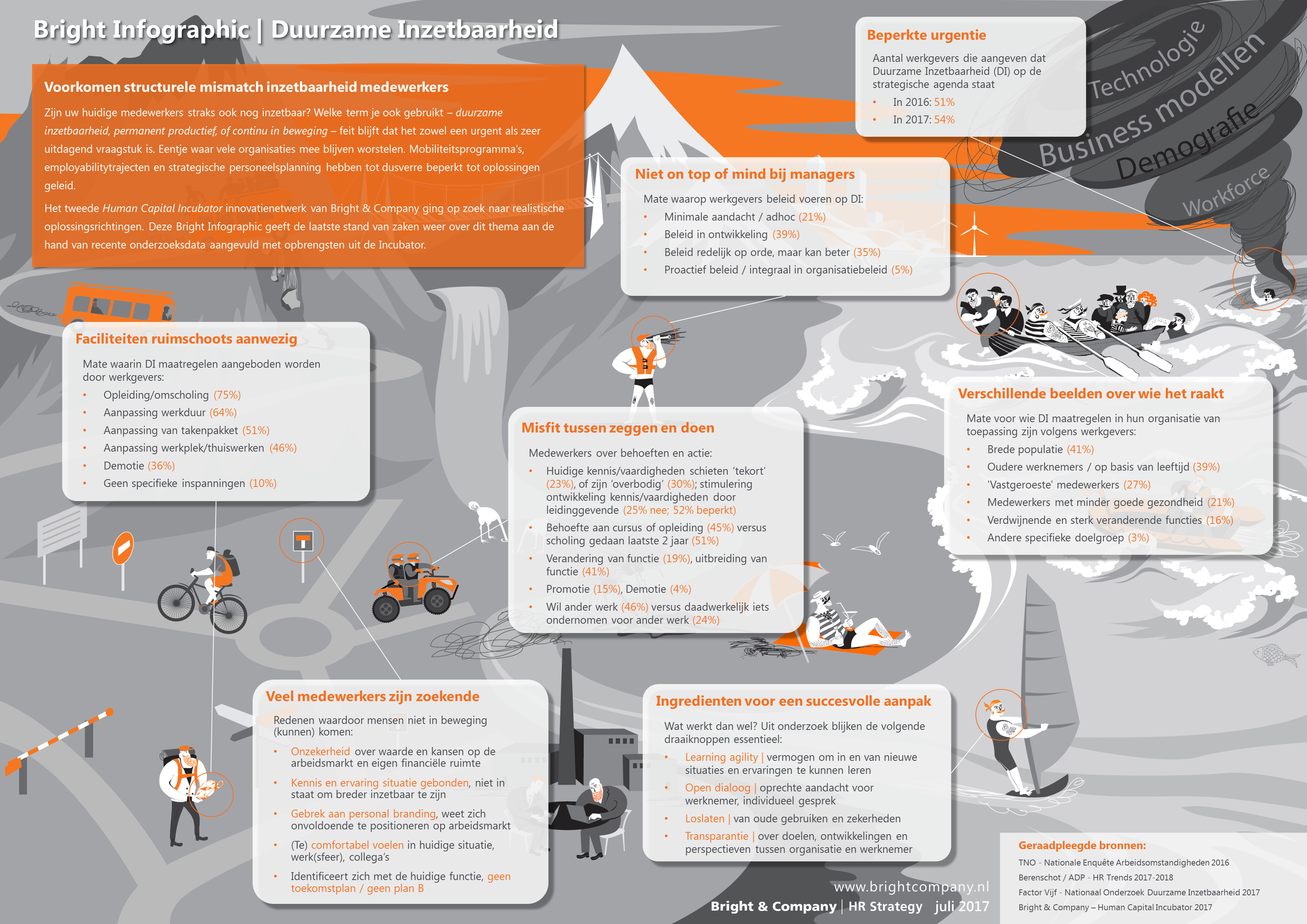 Zijn uw huidige medewerkers straks ook nog inzetbaar? Welke term je ook gebruikt – duurzame inzetbaarheid, permanent productief, of continu in beweging – feit blijft dat het zowel een urgent als zeer uitdagend vraagstuk is. Eentje waar vele organisaties mee blijven worstelen. Mobiliteitsprogramma’s, employabilitytrajecten en strategische personeelsplanning hebben tot dusverre beperkt tot oplossingen geleid. Het tweede Human Capital Incubator innovatienetwerk van Bright & Company ging op zoek naar realistische oplossingsrichtingen. In deze Bright Infographic leest u de laatste stand van zaken over dit thema op basis van recente onderzoeksdata aangevuld met opbrengsten uit de Incubator. Vragen die aan de orde komen zijn: